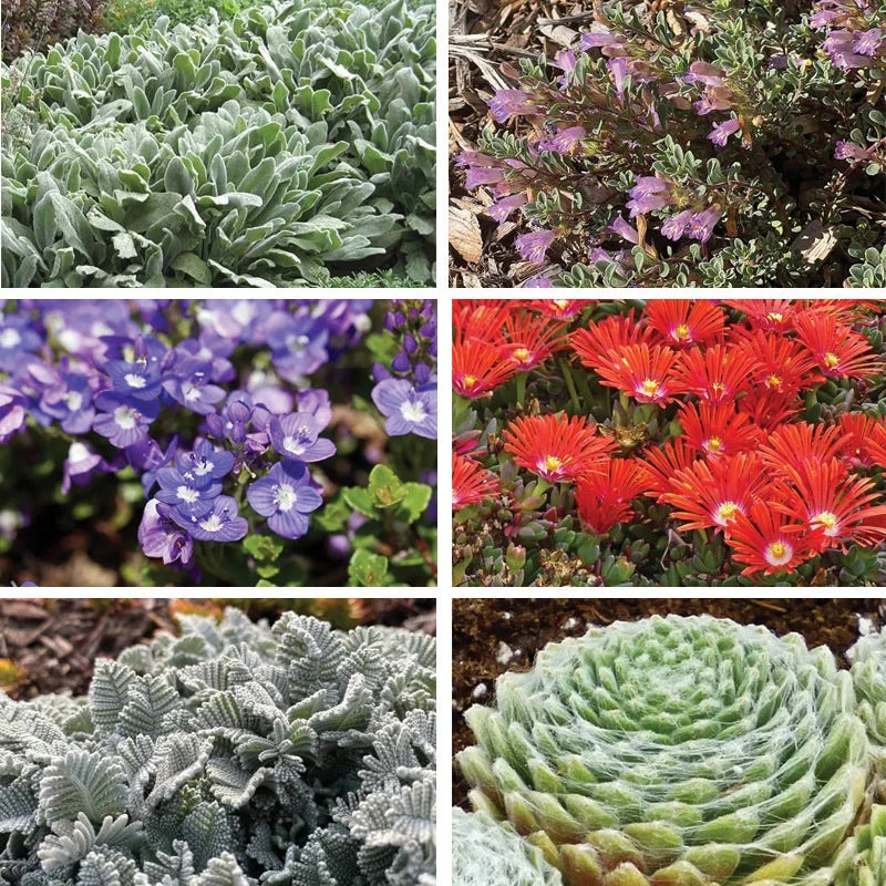 Our FireSmart Collection for Zone 1, the Immediate Zone of your yard, is designed to help you establish an ember-resistant defensible space within the first 5 feet of your home. This collection includes a variety of drought-resistant low-growing groundcovers and succulents that were selected for their high moisture content and mat-forming growth habit. Blooming groundcovers add pops of color throughout the season, blending with evergreen succulents to form a tapestry of color and texture.